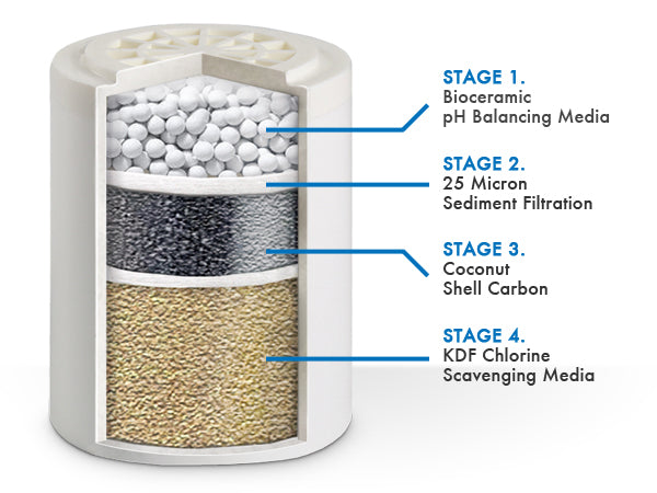The Hydro Guard™ Aqualux 4 stage filtration process utilizes Coconut Shell Carbon, KDF Chlorine Scavenging media, BioCeramic pH Balancing spheres and Sediment filtration to give you an invigorating shower experience.